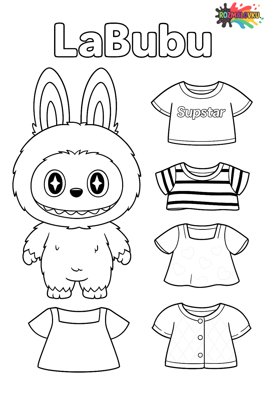 Розмальовка дівчинка Лабубу з одягом для переодягання — це чудова можливість для дітей поєднати гру та творчість. На малюнку зображена мила Лабубу, а поруч кілька варіантів вбрання: футболки з написами, смугаста кофтинка та кофточки. Дитина може самостійно обирати кольори, комбінувати стилі та створювати нові образи для улюбленого персонажа. Така розмальовка допомагає розвивати фантазію, дрібну моторику й уважність, роблячи процес веселим і захопливим.