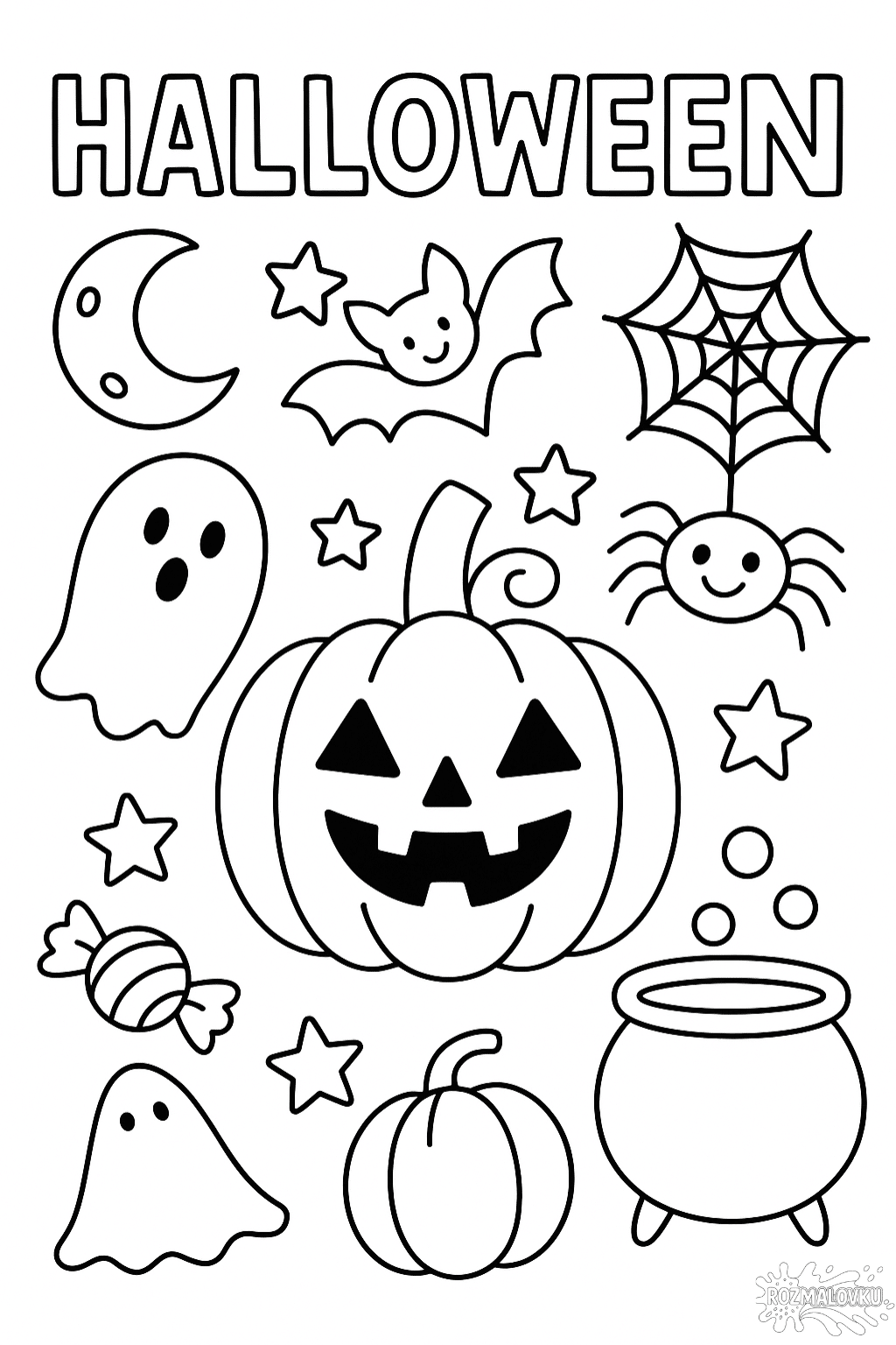 Святкова розфарбовка «Розмальовка Хелловін із гарбузом, привидами та кажаном» — чудовий варіант для дітей, які люблять творчість і свято Хелловіну. На цьому малюнку розмальовці зображено гарбуз-ліхтар, веселих привидів, кажана, павука, зірочки та чарівний кажан. Розфарбовуючи ці елементи, дитина вчиться поєднувати кольори, тренує дрібну моторику й розвиває фантазію. Роздрукуйте розмальовку у форматі А4 і дозвольте малюкові створити власну яскраву історію про ніч Хелловіну. Підійде для малечі будь-якого віку, зокрема для молодших дітей.