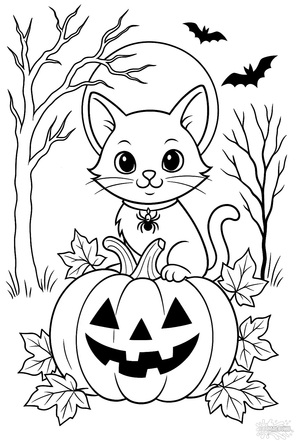 Розфарбовка «Розмальовка Хелловін котик і гарбуз» — це мила й святкова розмальовка для дітей, яка створює особливий настрій Хелловіну. На малюнку зображено чарівного котика з маленьким павуком на шиї, який сидить на гарбузі-ліхтарі серед осіннього листя, а навколо літають кажани. Така розмальовка допомагає дітям розвивати фантазію, дрібну моторику й посидючість, а також знайомить із символами осіннього свята. Надрукуйте у форматі А4 — і дозвольте дитині розфарбувати цю яскраву композицію у власному стилі.