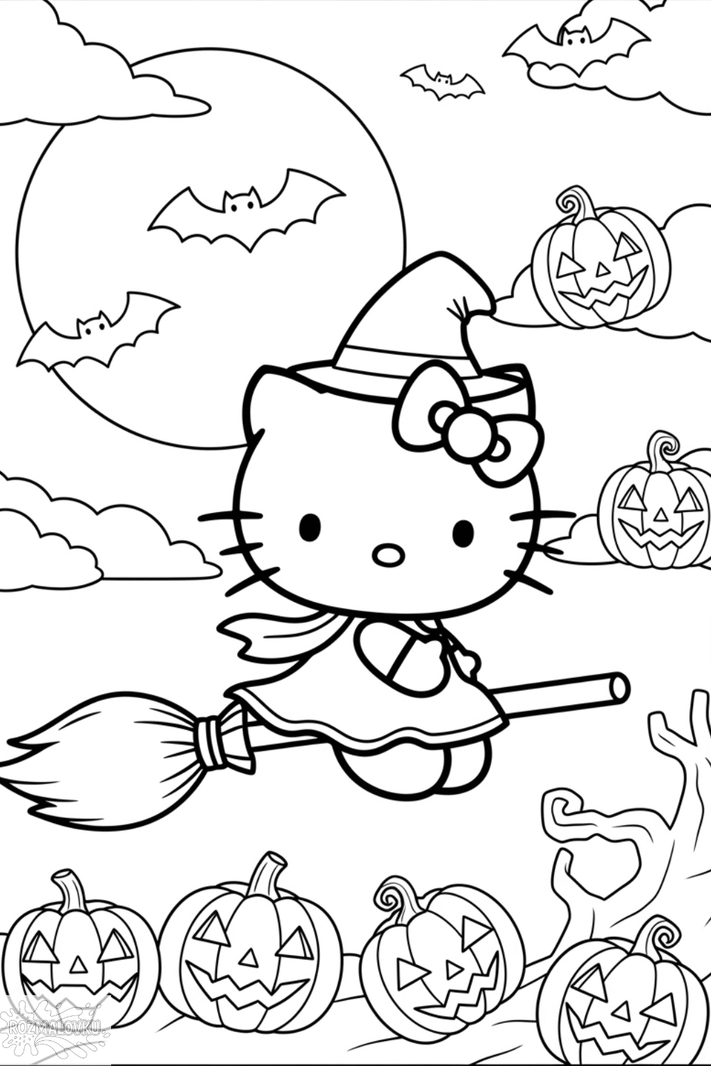 Розфарбовка «Розмальовка Хелловін з кітті на мітлі» — це чарівний малюнок розмальовка, який сподобається дітям, що люблять свято Хелловіну. На зображенні мила кітті у костюмі відьми летить на мітлі серед кажанів, місяця та гарбузів із веселими обличчями. Така розфарбовка не лише створює святковий настрій, а й допомагає дитині розвивати уяву, дрібну моторику та відчуття кольору. Роздрукуйте малюнок у форматі А4 і дозвольте дитині розфарбувати свій власний магічний світ. Ідеально підійде для дітей дошкільного та молодшого шкільного віку.