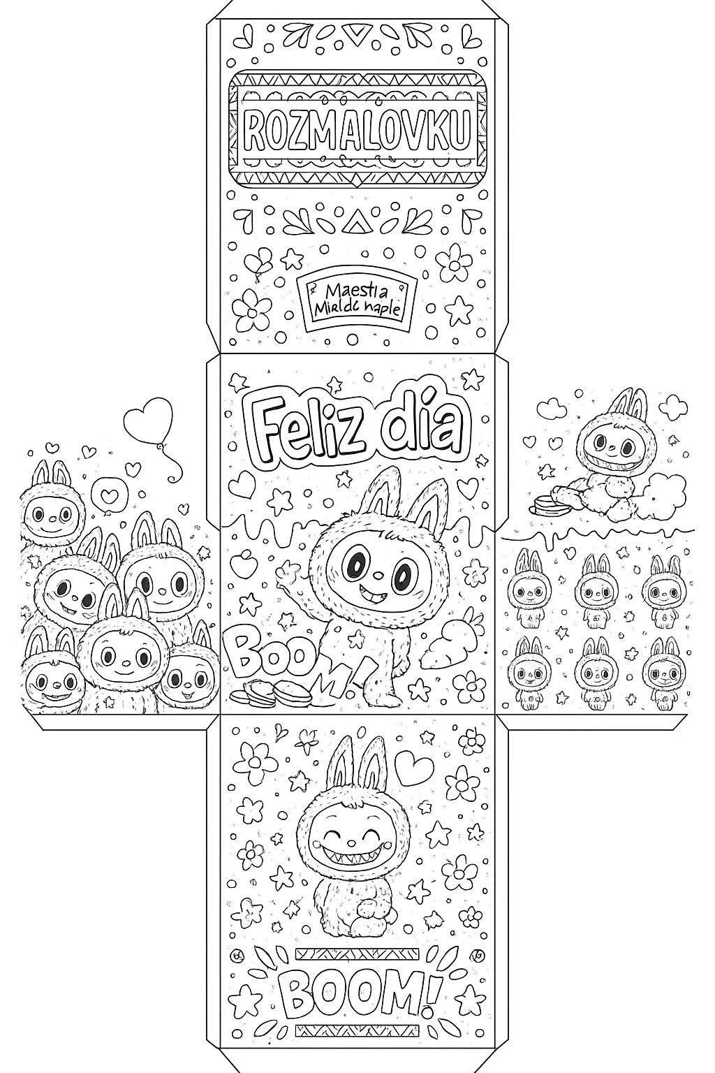 Розмальовка Лабубу — подарункова коробочка створена для того, щоб зробити творчий процес ще цікавішим. На картинці зображений милий персонаж Лабубу в оточенні сердечок, зірочок і квітів, а також різні святкові елементи. Дитина може розфарбувати коробочку на свій смак, вирізати та скласти її, отримавши оригінальну упаковку для маленького подарунка. Така розмальовка розвиває фантазію, уважність і дрібну моторику, даруючи радість і натхнення від власноруч створеної речі.