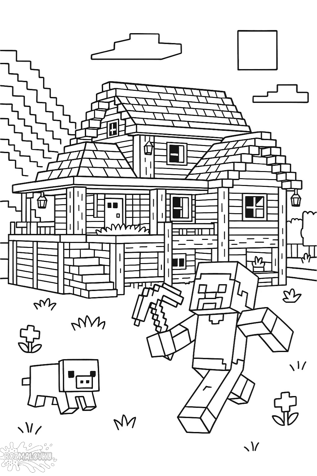 Розмальовка Майнкрафт дім та герой — чудовий вибір для всіх шанувальників популярної гри. На малюнку зображений персонаж із киркою, що повертається до свого затишного будинку, поруч бігає свинка. Ця картинка створює атмосферу пригод і творчості, адже в Майнкрафті можна будувати власні світи та насолоджуватися дослідженням. Дітям буде цікаво розфарбувати сцени з гри, розвиваючи уважність і фантазію, перетворюючи чорно-білу сторінку на яскравий витвір.