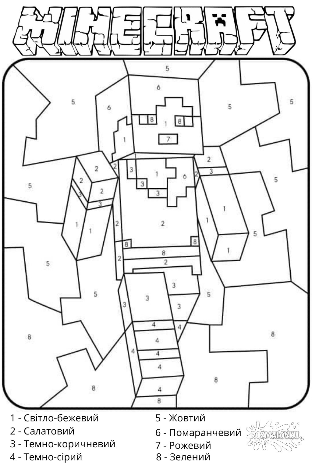 Розмальовка Майнкрафт героя по номерам стане чудовою розвагою для дітей, які люблять цю гру. Вона не тільки допоможе розвинути увагу та акуратність, а й навчить підбирати кольори відповідно до схеми. Кожна ділянка має свій номер і відтінок — від світло-бежевого до рожевого чи зеленого. Така активність робить процес розфарбовування цікавим квестом, а результат порадує яскравим героєм із світу Minecraft.