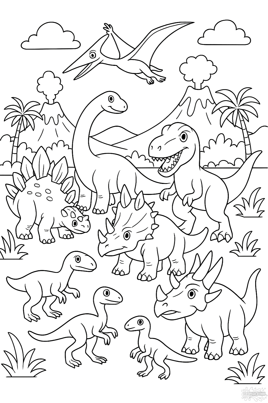 Розфарбовка Світ динозаврів перенесе дитину в доісторичну епоху, коли на Землі жили велетенські істоти. Тут можна зустріти Тиранозавра, Трицератопса, Стегозавра, Брахіозавра та навіть літаючого Птеранодона. Малюнок створений у дружньому, казковому стилі — ідеально підходить для дітей молодшого віку. Розмальовуючи цю картинку, малюк дізнається більше про динозаврів, тренує уяву, уважність і дрібну моторику. Скачайте безкоштовно розмальовку Світ динозаврів у форматі А4 та оживіть свій юрський світ яскравими фарбами!