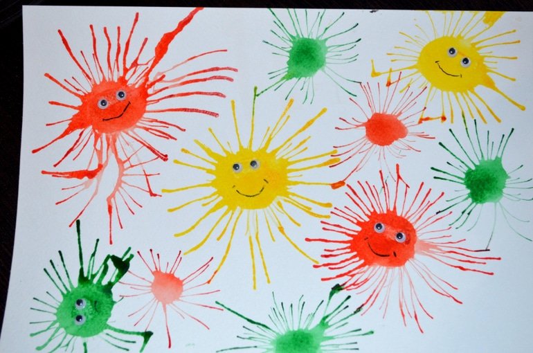 Це техніка, у якій малювання майже не відрізняється від гри — тому вона так подобається дітям. У мильний розчин додають трохи фарби, видувають бульбашки, а потім прикладають аркуш до піни, щоб отримати візерунки з кружалець і ажурних слідів. Такі малюнки нетрадиційними техніками чудово працюють як фон: підводний світ, казкові хмари, планети, святкові листівки. Важливо контролювати процес, щоб дитина дула, а не втягувала рідину, тому для малюків краще використати трубочку з обмежувачем або просто бути поруч і підказувати. Це одна з найбільш «легких» розвивальних технік малювання: навіть кілька відбитків виглядають цікаво, і дитина одразу відчуває успіх.